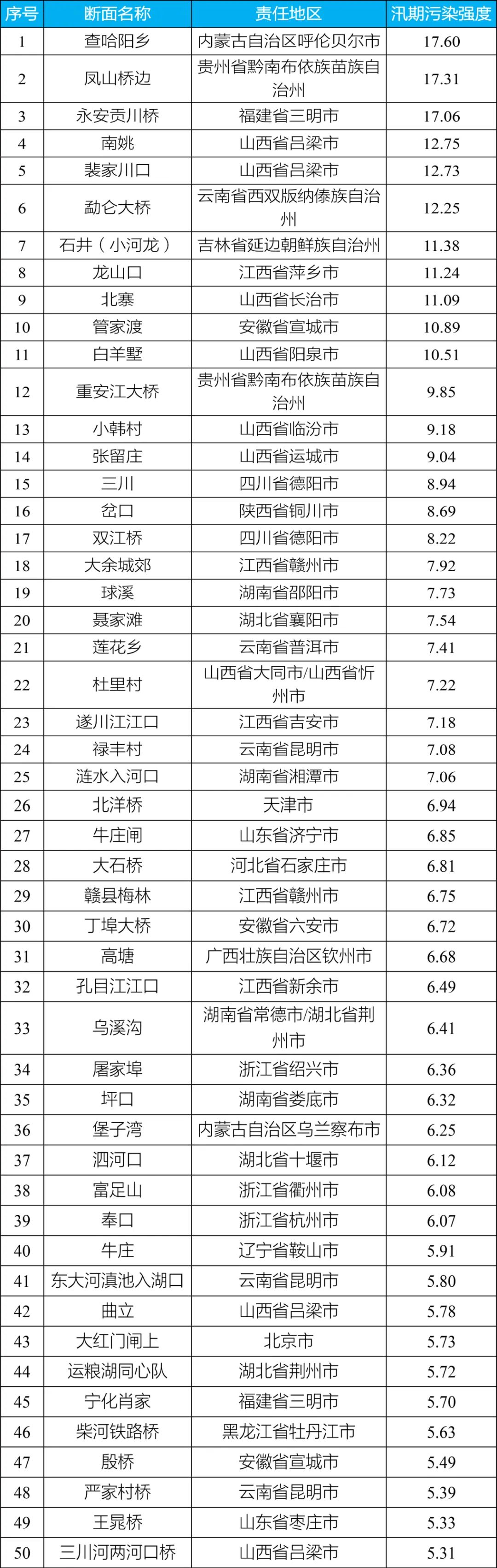 2022年上半年地表水汛期污染強度前50名斷面清單