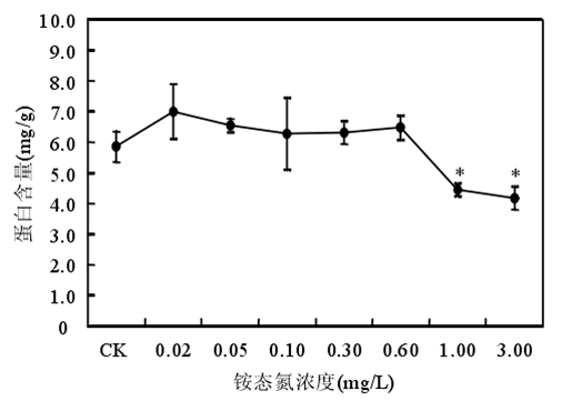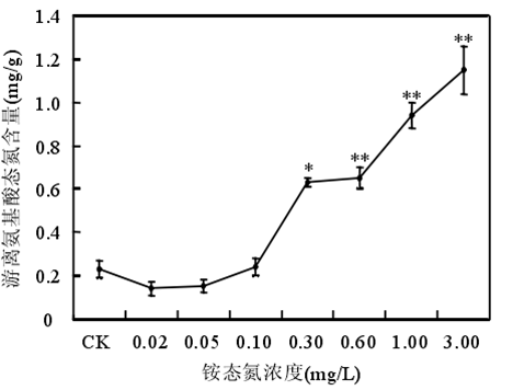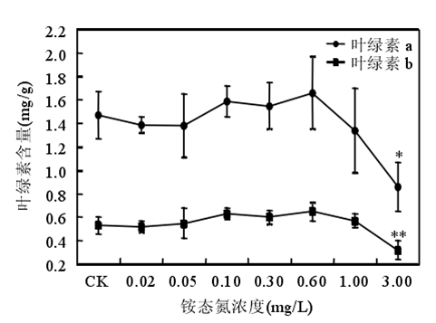 銨態(tài)氮濃度低于 0.60mg/時苦草生長良好,濃度大于或等于 1.00mg/L 時苦草的光合能力受到抑制、代謝受到干擾??嗖輰︿@態(tài)氮最敏感的生理生化指標是葉片中游離氨基酸態(tài)氮含量。銨態(tài)氮作為沉水植物的一種營養(yǎng)物質,當其含量較低時,植物由于營養(yǎng)缺乏誘導產生自由基。