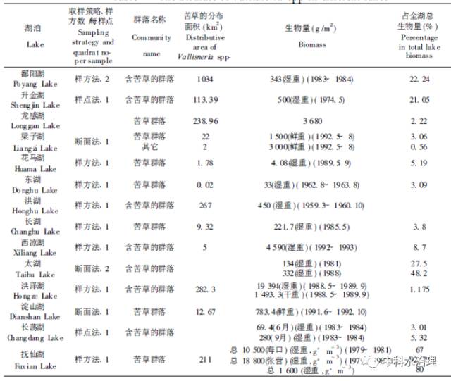 在很多湖泊植被調查工作中都對苦草群落或含苦草的群落生物量進行了測定(見下圖)。從表中可以看出,最高和最低生物量之間存在上千倍的差異。這一方面是因為調查對象尚包括其它種類,而非苦草本身; 另一方面,也是由于調查方法本身所致: