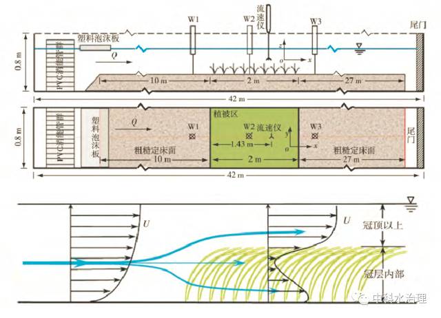 (1) 冠層以上,水流不受苦草冠層的影響,時均流速呈對數(shù)分布; 冠層內部,由于冠層阻流面積在垂線分布上存在差異,冠層內時均流速呈逆梯度分布,且在床面附近出現(xiàn)局部流速最大值。
